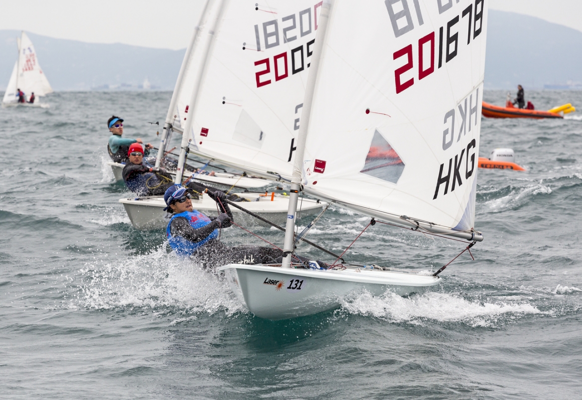 A building north-easterly breeze was felt across most of the race track with much stronger conditions and swell on the Lasers, 29ers and 420s course near Po Toi Islands. With an average of 16kts and gusts to 20kts+ there was some tight racing between the Laser Radials and the pack stuck together most of the way around the track.